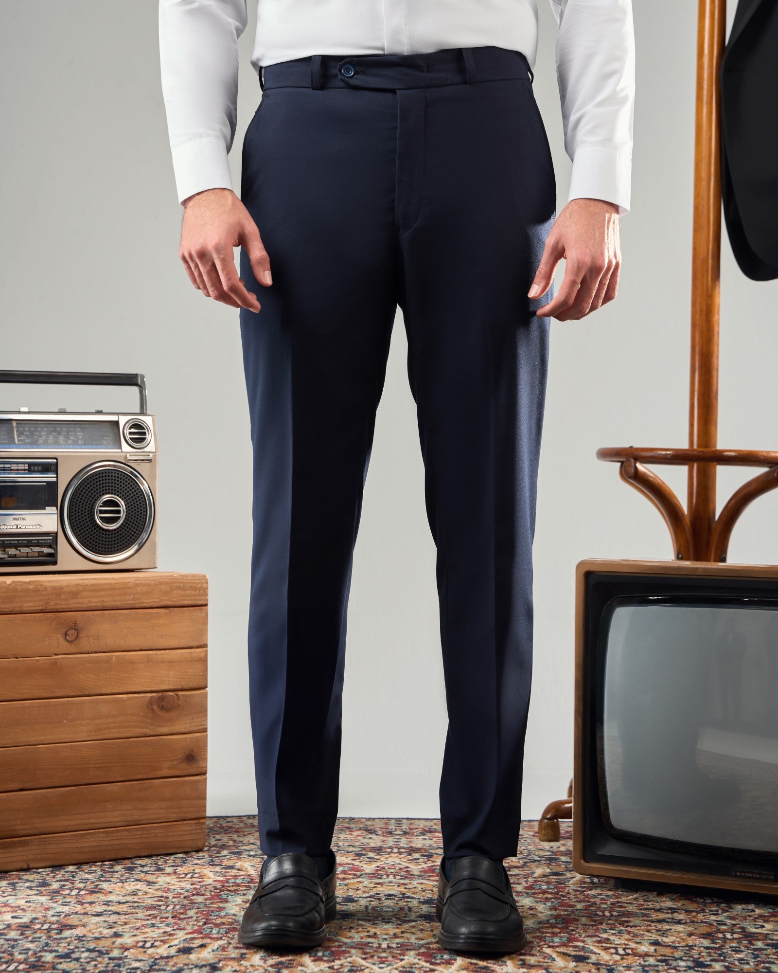 THE TAILORED NAVY-BLUE TROUSERS CREATE A STRIKING CONTRAST